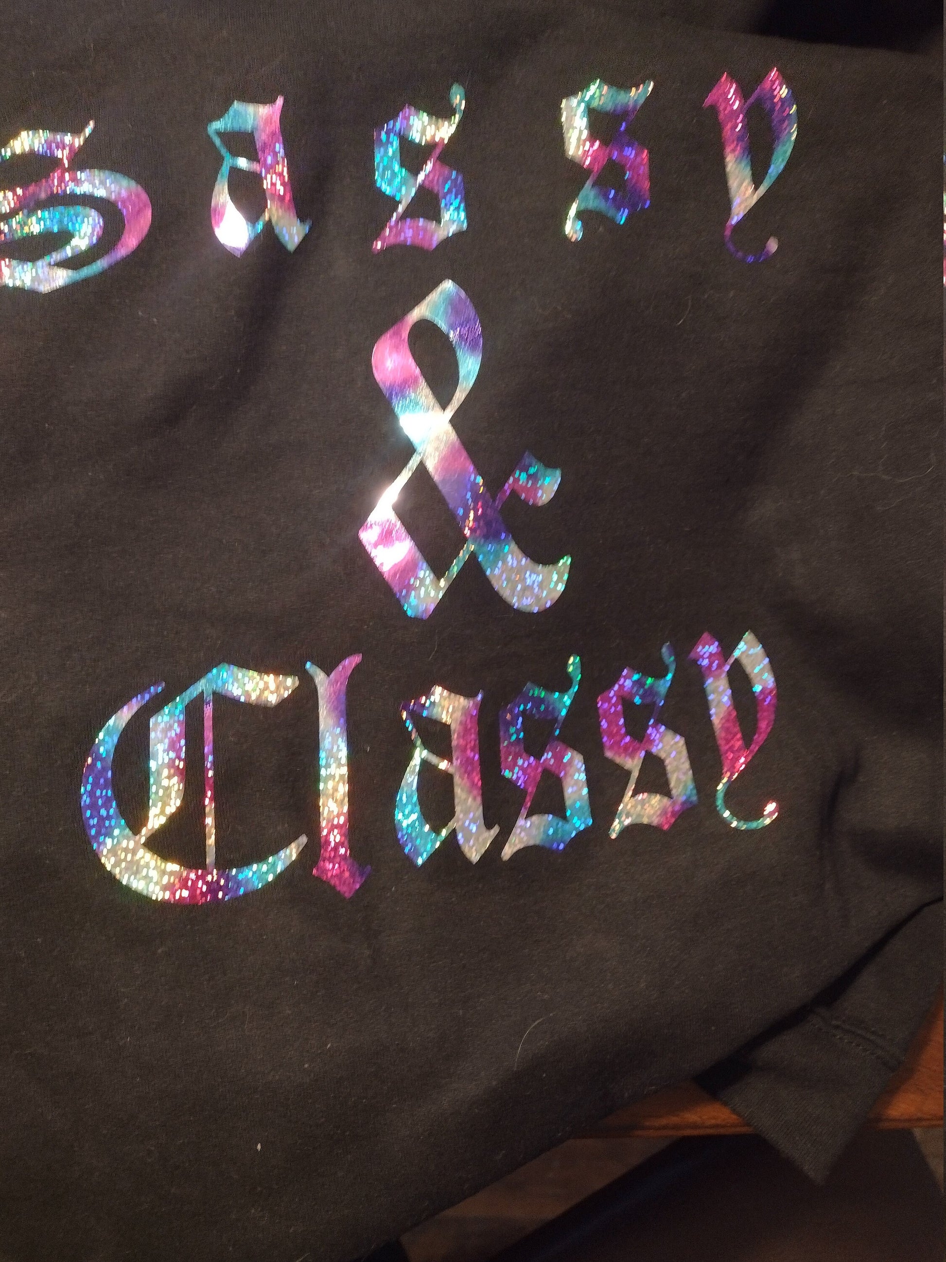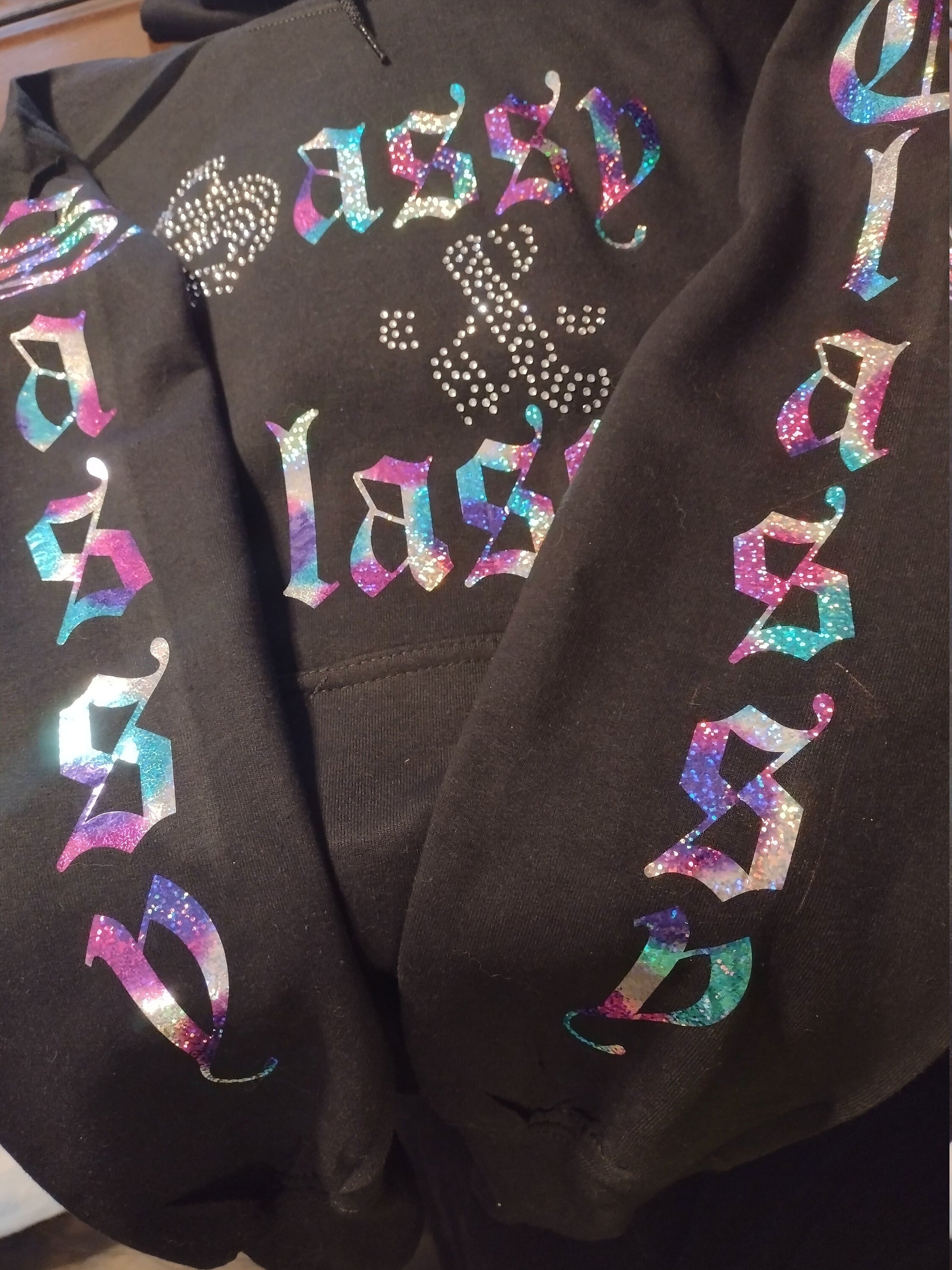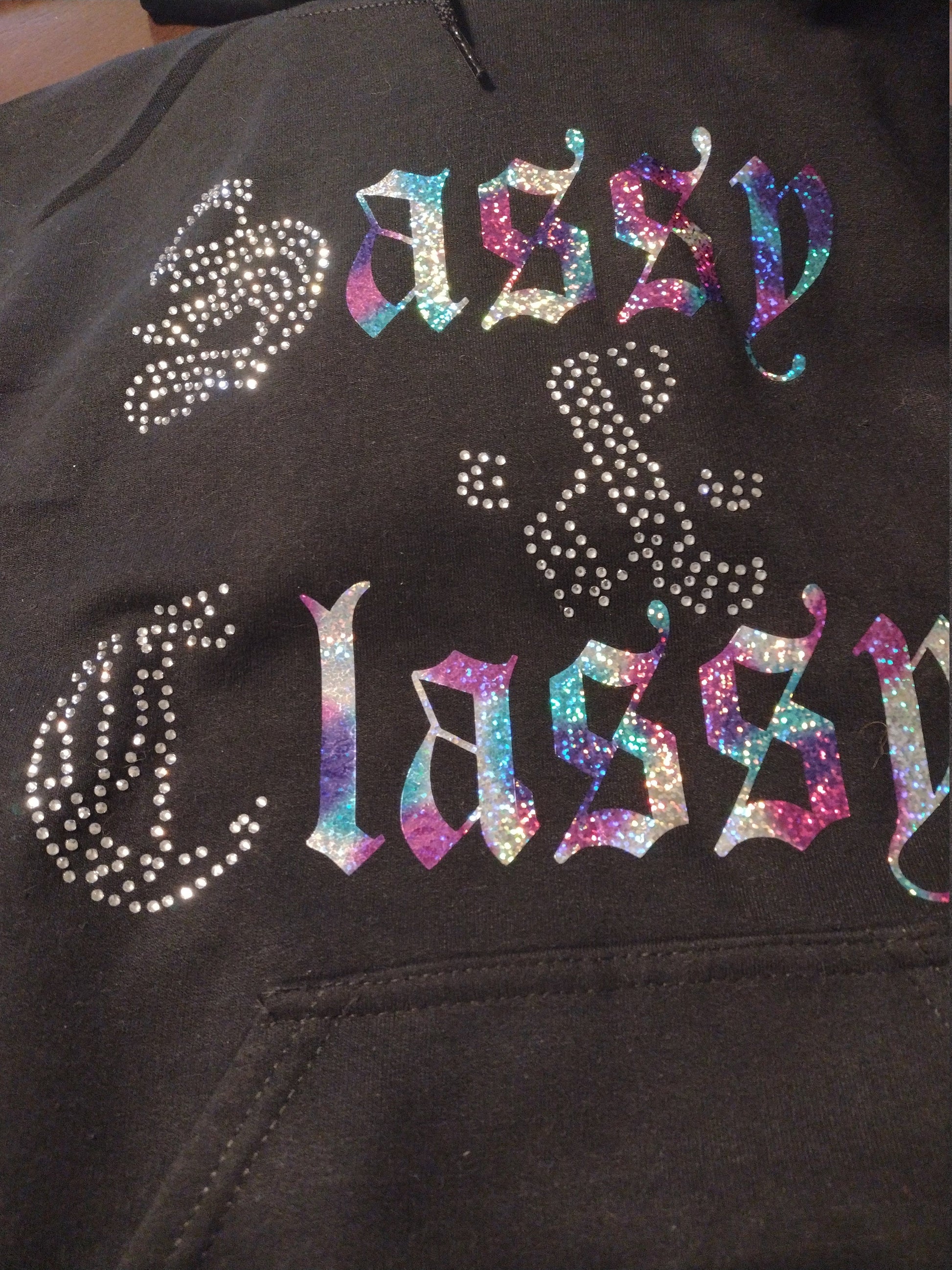 Sassy & Classy - Created with Rhinestones and Vinyl! You choose your colors - Hoodie, Rhinestone, and Vinyl!, Types of Vinyl are Rainbow, Polka Dots as well as many color glitter types of vinyl.