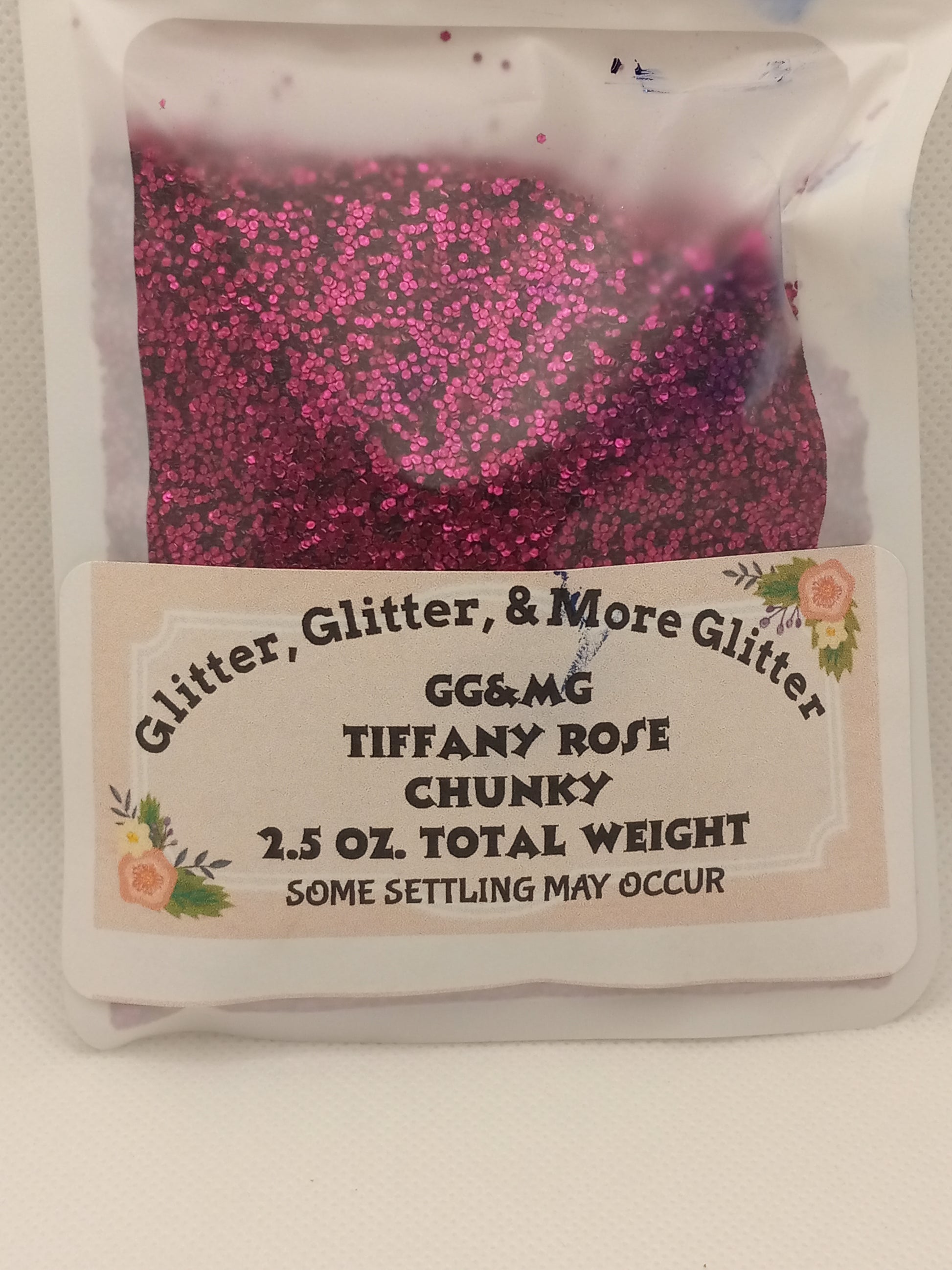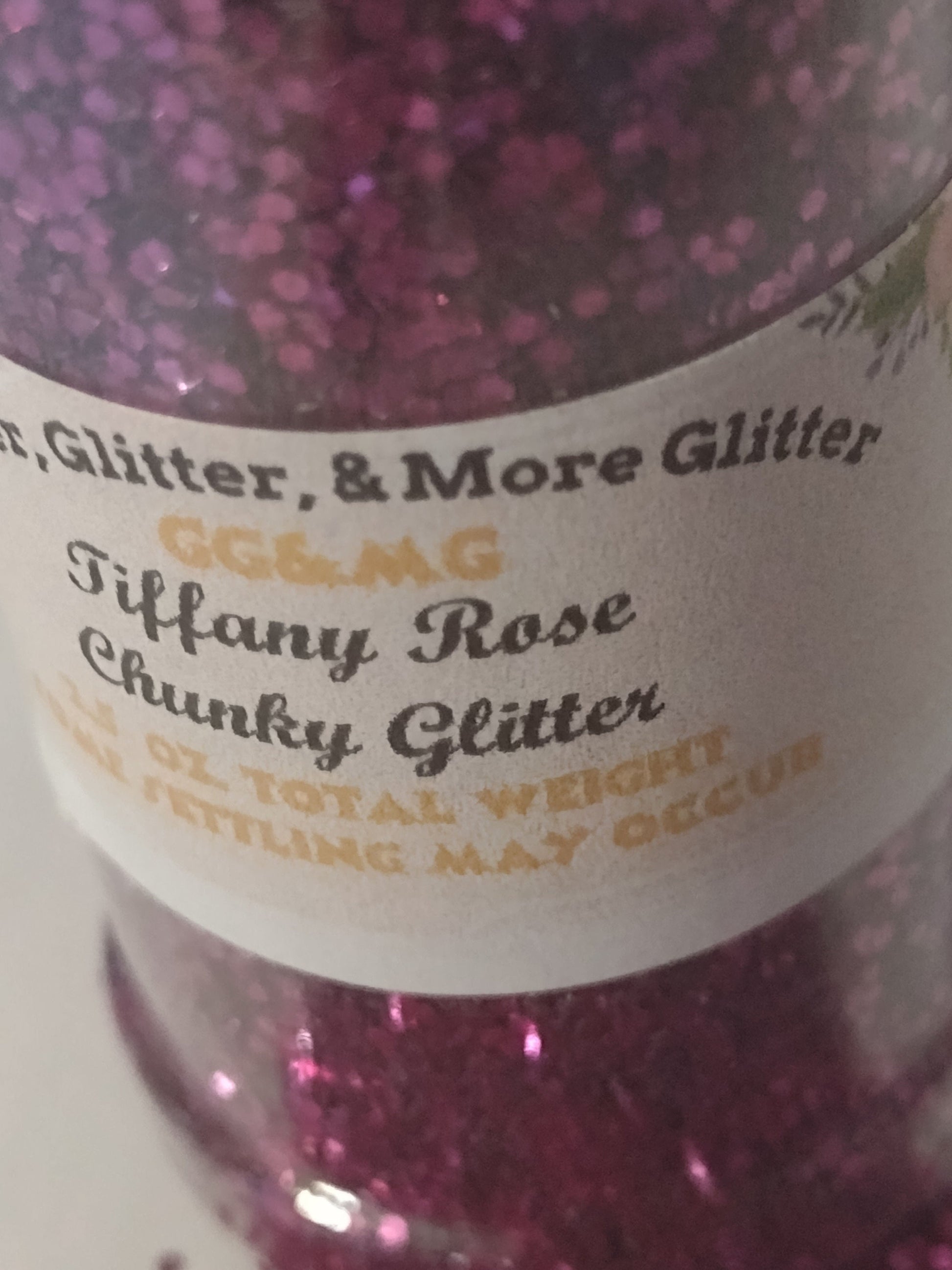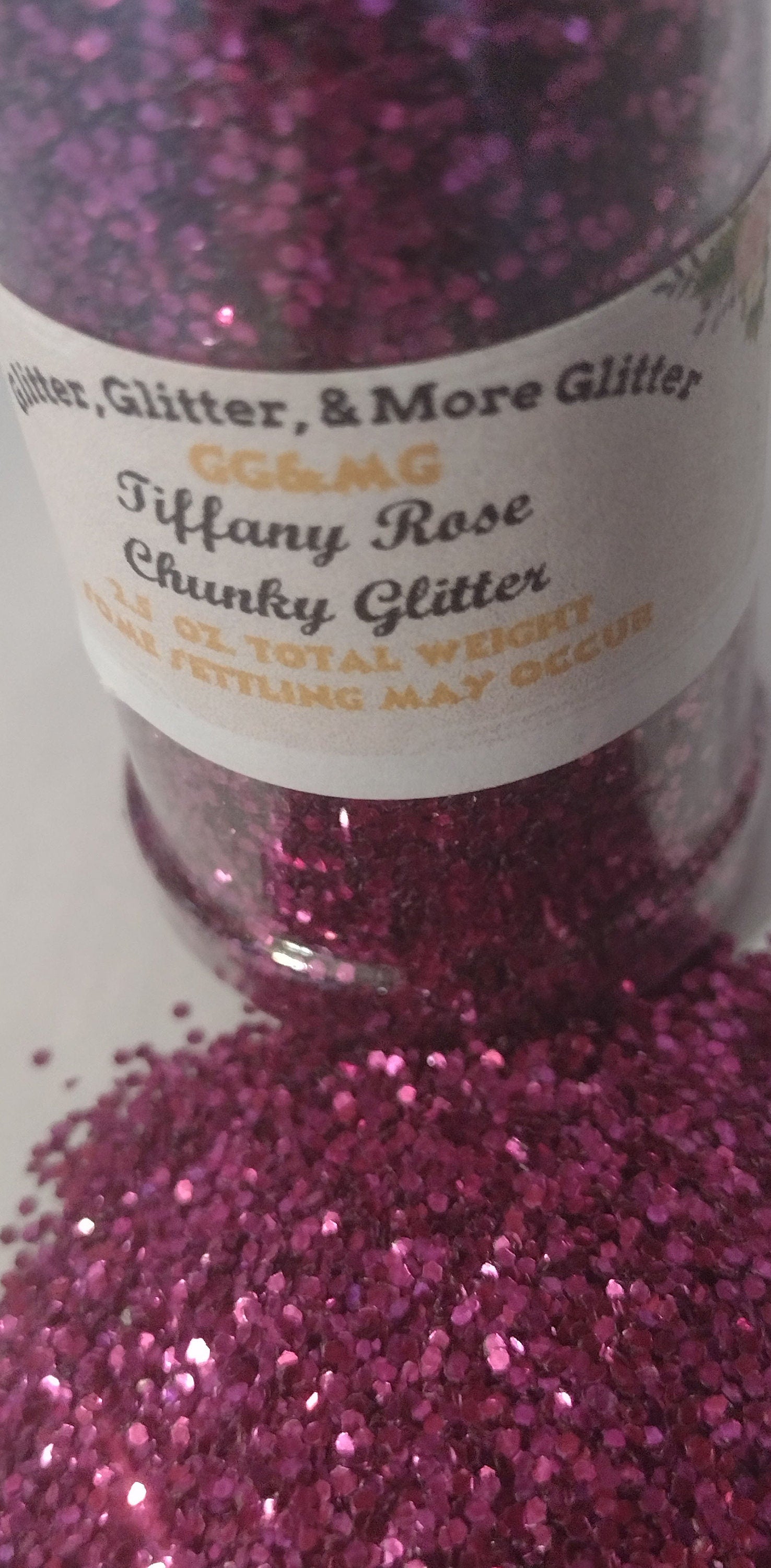 Tiffany Rose – Chunky Flakes of Rose Glitter. This flake is larger than a regular-size glitter flake but smaller than an X-Chunky flake.